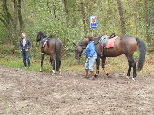 Na het spel vertrokken de ruiters op zoek naar de picknick die Tonneke en Elvie prima verzorgd hadden. De paarden stonden heerlijk rustig en de ruiters genoten van een broodje met of zonder knak. Bij de picknick was het voornamelijk uitrusten, spieken bij anderen welke foto’s zij hadden en natuurlijk weer een spel waarbij punten gehaald konden worden. Dit keer was het een spel waarbij met een met een bekertje een pinpongbal gevangen moest worden waarop in totaal een toren van 6 bekertjes met 6 balletjes moet ontstaan. Viel echt niet mee!!
